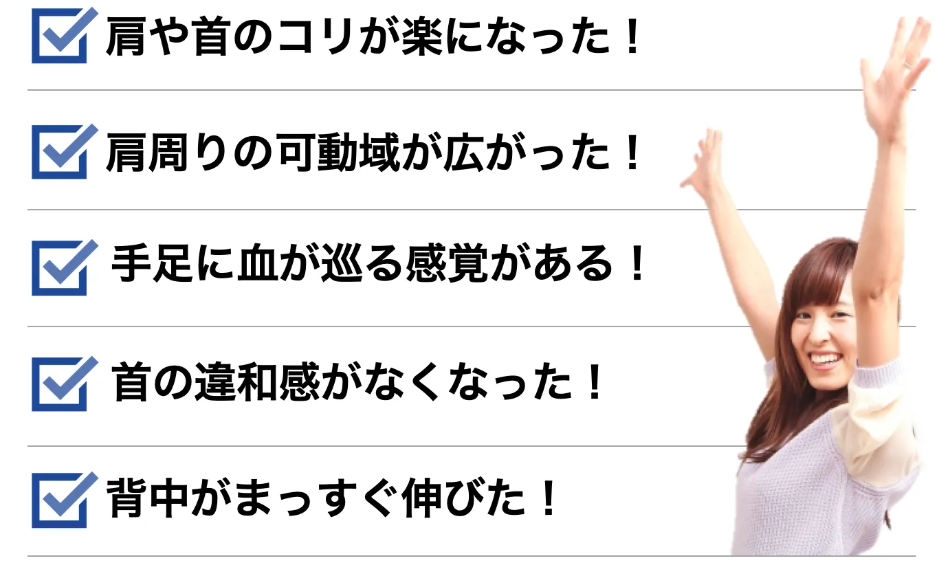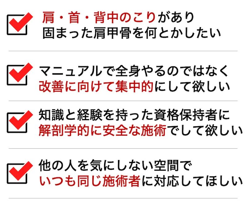 「肩・首・背中の症状」の施術経験も豊富ですので安心してご利用下さい。